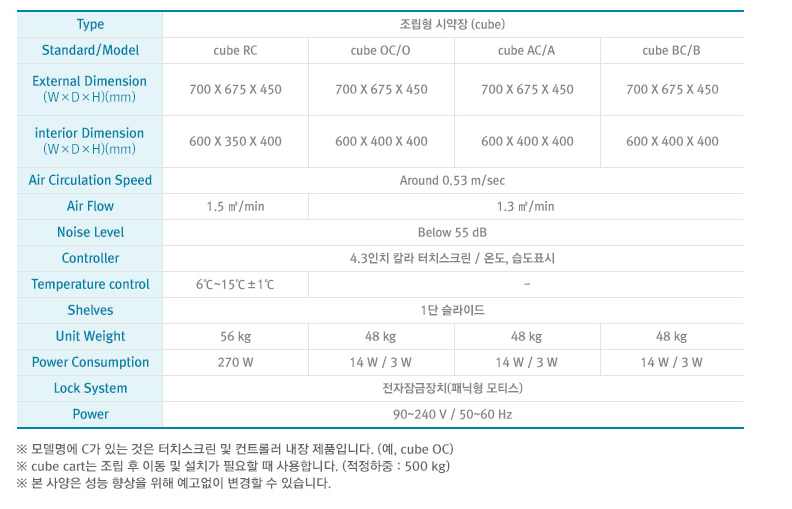 (저온보관용, 산성용, 유기용제용으로 나눠 보관할 수 있는 분리형 시약장입니다.)