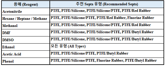 🧪 Septa 화학물질 호환성표 (Septa Compatibility Table)